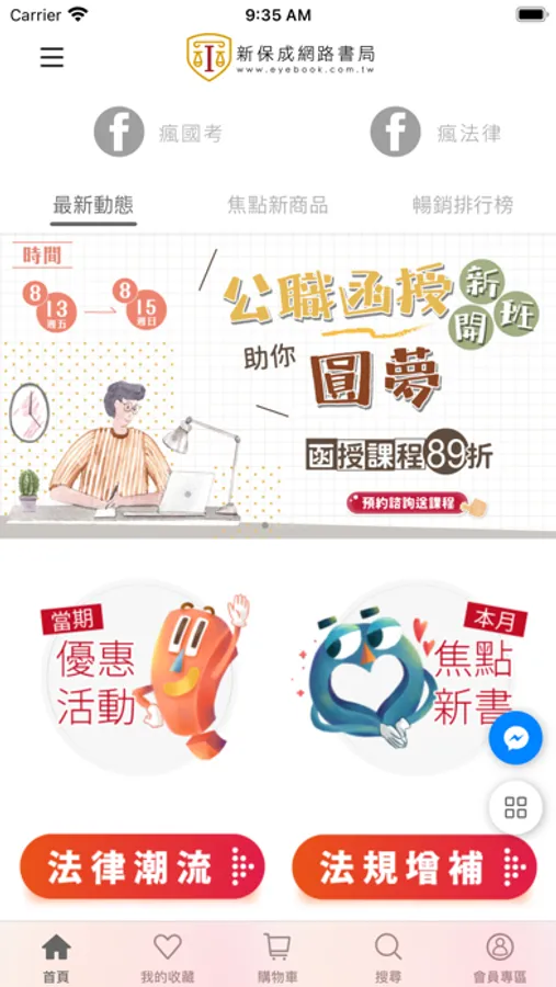 隨時隨地獲取最新考試資訊、名師實用課程資訊、線上試讀考用書、購書購課最便利!