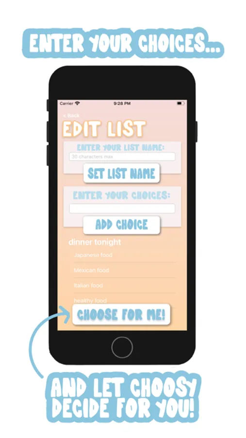 HOW IT WORKS: Press "Click Here" to start, enter and set a list name (title of what you're deciding, e.g. dinner tonight), add your choices, and click "Choose for me!"