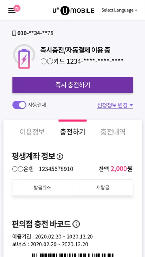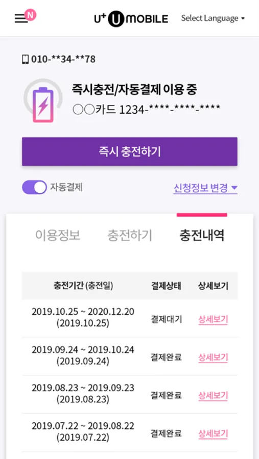 다양한 언어 국가 지원 및 쉽고 편리한 간편 로그인으로 언제 어디서나 충전, 알림설정, 충전 내역 확인 까지 이용 할 수 있는 U+ 유모바일의 충전 어플리케이션입니다.