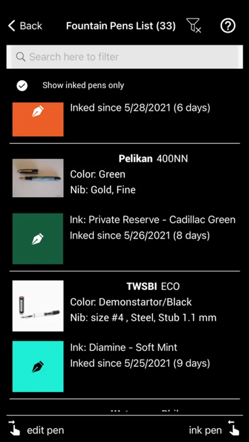 My fountain pens is the application about all of your past, present and future fountain pens. It will give you an answer to the question: which fountain pens do I already have and why do I need one more? Or two?