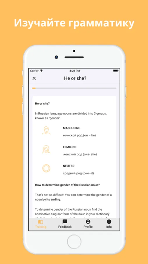 We developed an excellent app that allows you to follow the study plan regardless of where you are and learn Russian step by step. This app is suitable for all who wants to study Russian language from scratch or to improve language skills.