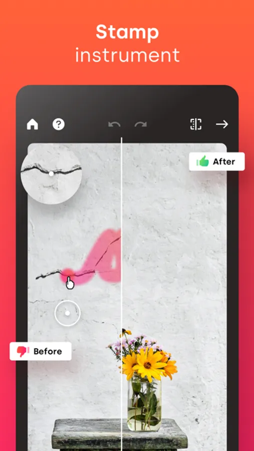 The app declutters photo imperfections and retouches them in an extremely simplified, yet smart way. The editor makes sure that the chosen area is erased without the photo distortion and is repaired appropriately.