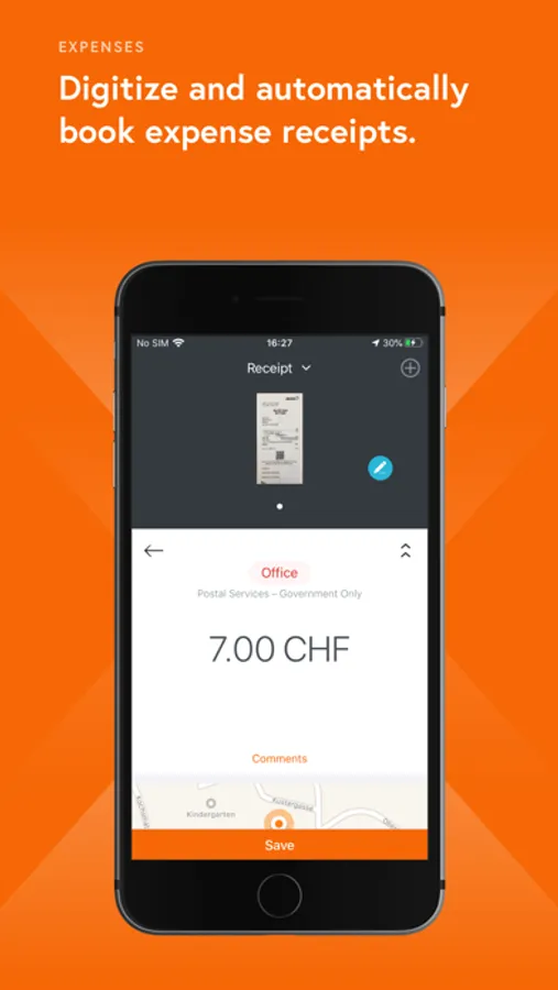 When processing an expense receipt, the app is able to use character and text recognition to automatically retrieve information such as the amount, VAT and point of sale and subsequently book it.