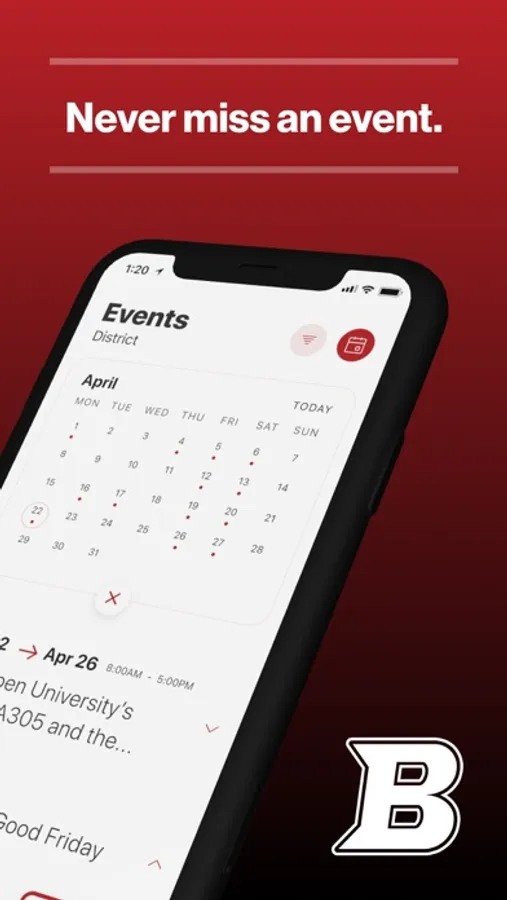The event section shows a list of events throughout the district. Users can add an event to your calendar to share the event with friends and family with one tap.