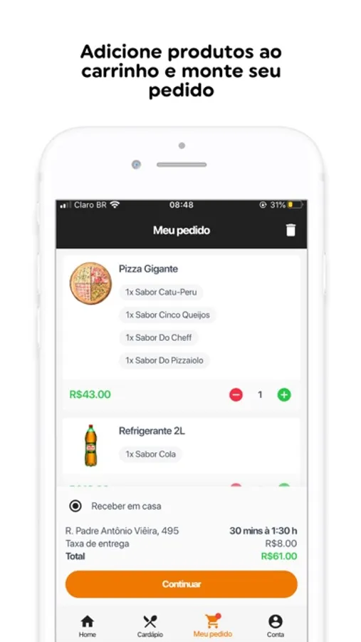 No app, você encontra de forma rápida o cardápio completo e ainda pode utilizar a ferramenta de busca para localizar diretamente os produtos que você deseja.
