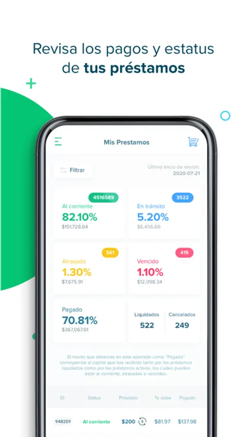 · Observar los préstamos en los que has invertido y filtrarlos de acuerdo a tus preferencias.