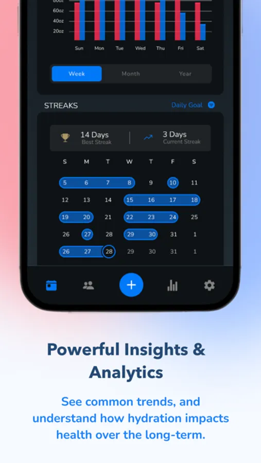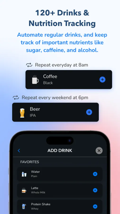 Powerful drink reminder capabilities that adapt to your needs. Carefully designed to be helpful but not annoying.