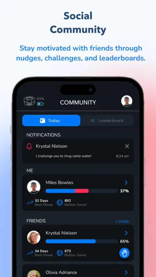 Connect with friends, family, and colleagues. Stay motivated through nudges, challenges, and leaderboards.