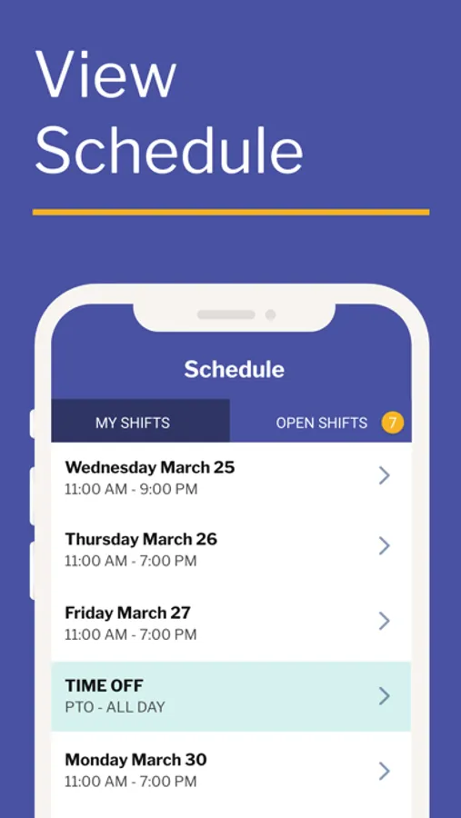 Team Members are notified when their work schedule has been published or updated. Team Members can message others in their department, swap shifts, ask for time off, call off a shift, or view and claim open shifts.