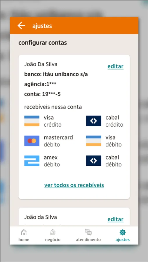 No menu atendimento, você pode ver as maquininhas, consultar as perguntas frequentes e acessar nosso atendimento via chat.