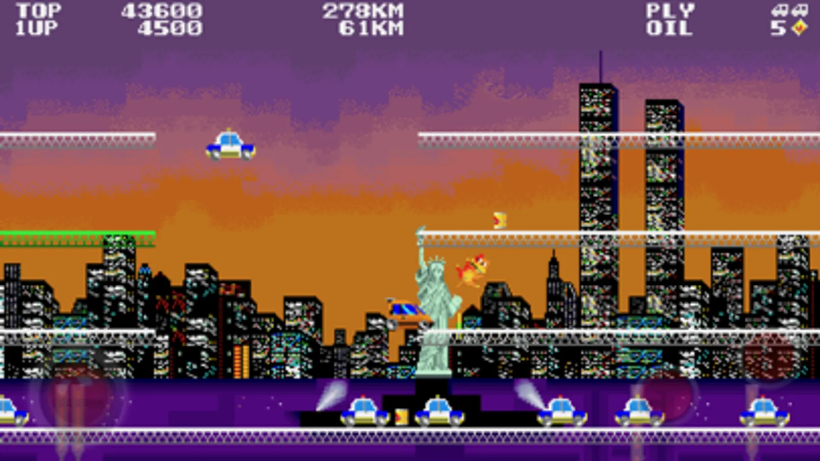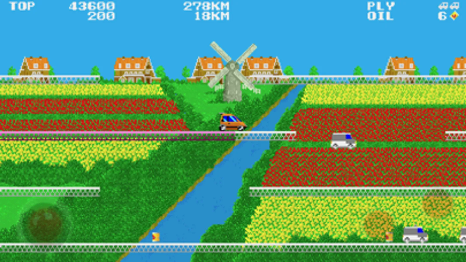 Must paint all the road throughout countries, each taking place in a famous city from around the world (USA, Spain, UK, France, Australia,...). Your car is constantly under pursuit by police and taxi cars, which you can take out by launching oil cans at them, stunning them, and then ramming into them with your car. Your car can jump over large gaps to reach higher sections of the stage.