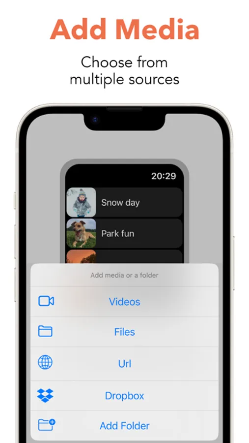 ● Add media from your iPhone, iCloud, Google Drive, Dropbox, and more sources