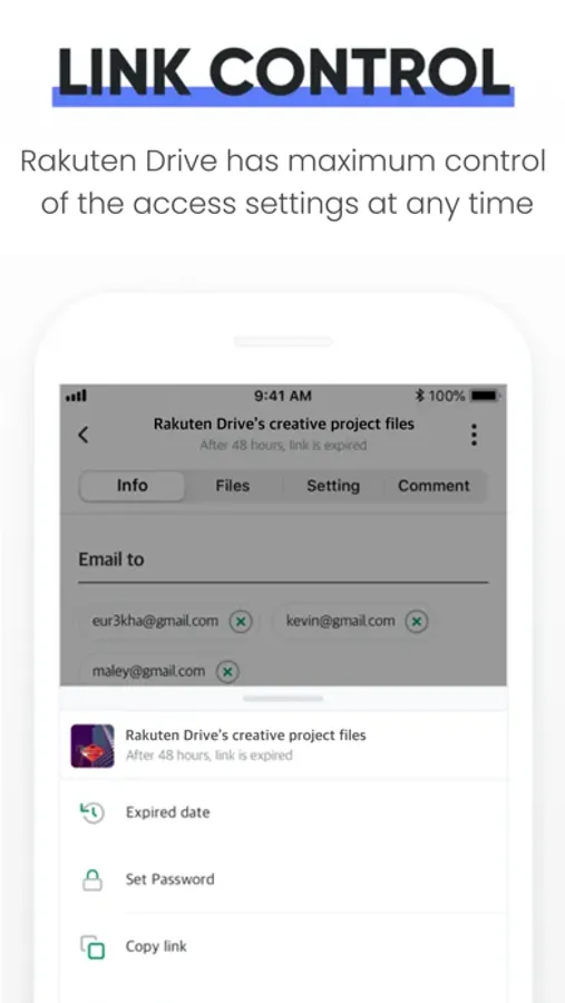 Any files saves in your device or Rakuten Drive Cloud can share with your work email without any limits.