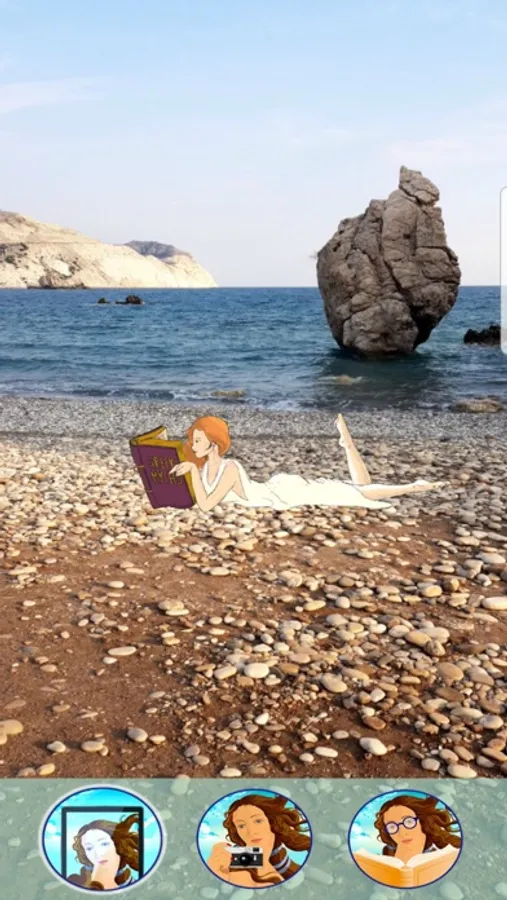 AR Mode: Use the camera of your device and by pointing it onto various points on the beach you can see the animated Aphrodite in front of you.
