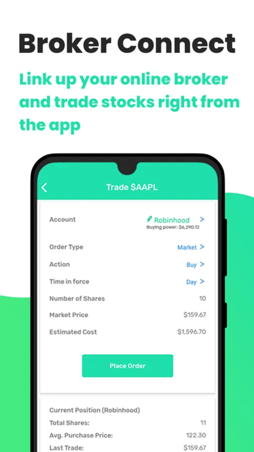 - Broker Connect: Link up your online broker and trade stocks right from the app; current integrations include ETrade, TDAmeritrade, Robinhood, and Webull