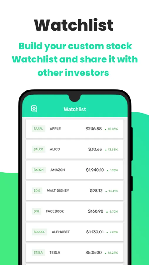 - Custom Watchlist: Build your custom stock Watchlist and share it with other investors
