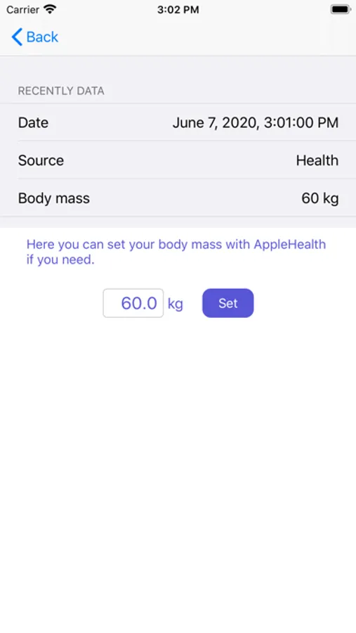 *This app works in the connection with Healthcare. This app obtains a BPM and calories via Apple Healthkit, and then record them onto Workout. And this app is adapted for reading and writing weight data.