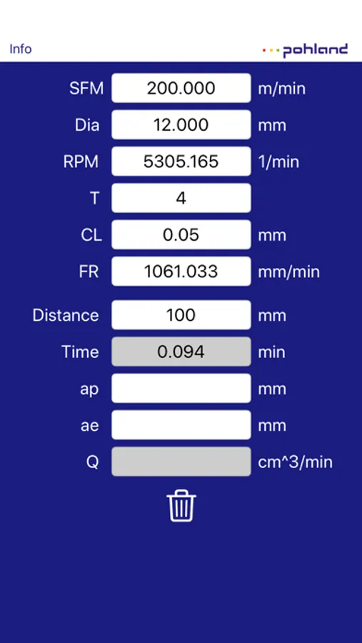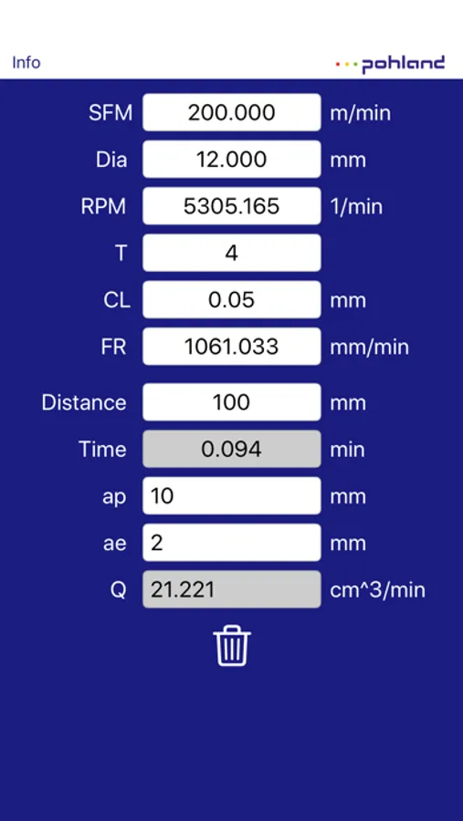 Simple app for fast calculation of cutting data for milling, turning and drilling. The speed, cutting speed, feed rate and machining time are calculated. After input, the app calculates all values resulting from the input. To calculate, simply click in the next input field or anywhere on the screen.