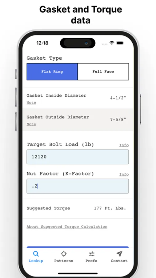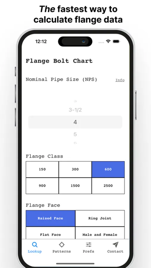 2. Instant flange bolt sizes and torque patterns: Just enter the flange size, class, and type and the app instantly populates the correct values from the flange bolt size chart and the flange torque sequence chart, along with wrench size.
