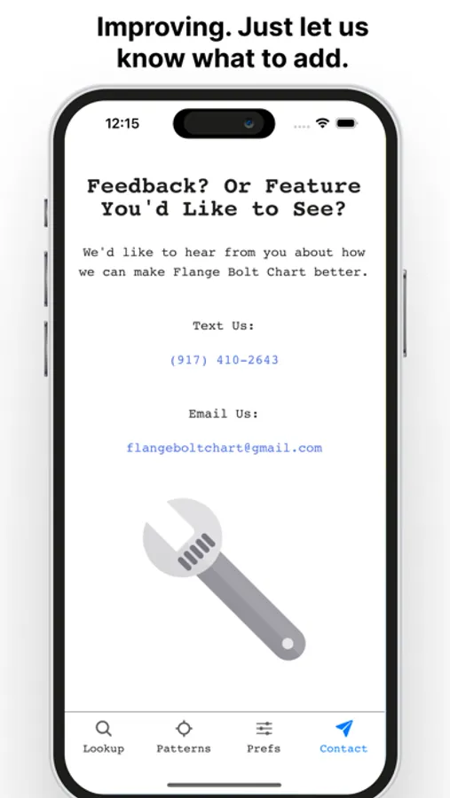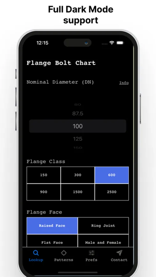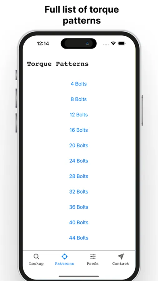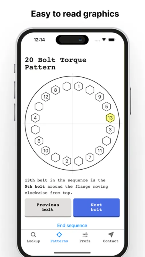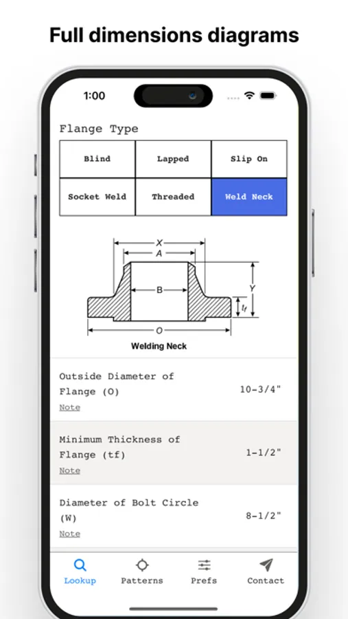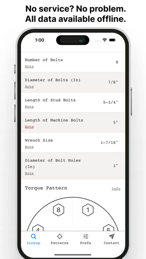Look up flange dimensions, bolt sizes and torque patterns in three taps with Flange Bolt.