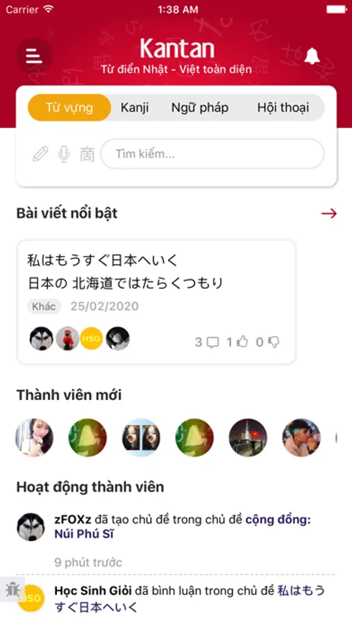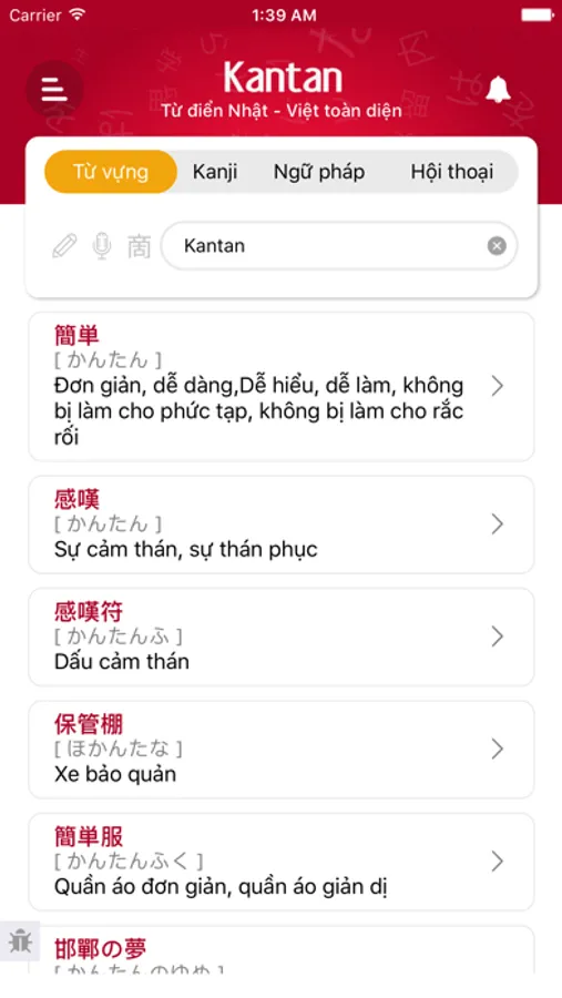 Kantan là một ứng dụng từ điển Nhật - Việt mạnh mẽ và thông minh. Nó cho phép bạn tìm từ song ngữ Nhật - Việt hoặc Việt - Nhật, chữ Hán, câu ví dụ, ngữ pháp, cách sử dụng ngữ pháp một cách nhanh chóng và dễ dàng hơn tất cả các ứng dụng khác.