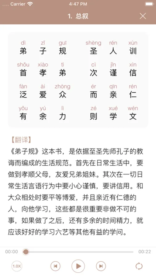 《弟子规》是清代教育家李毓秀所作的三言韵文。其内容采用《论语》“学而篇”第六条:“弟子入则孝,出则悌,谨而信,泛爱众而亲仁。行有余力,则以学文”的文义,以三字一句、两句一韵编撰而成。全文共360句、1080个字。