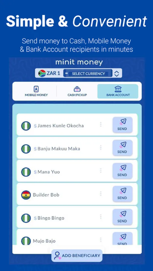 minit money is an instant international & local money transfer app that sends money to your loved ones in minutes. minit money is simple to use and anyone can sign up quickly using their valid SA ID Card/Document or Passport. Money can be sent from over 100 000 supermarkets like Pick n Pay, Checkers or Game simply by paying at any till point, or directly from your bank account within the app.