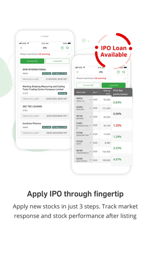 - IPO function with IPO financing service is available. Apply for an IPO in just 3 steps. Track the market response and stock performance after listing.