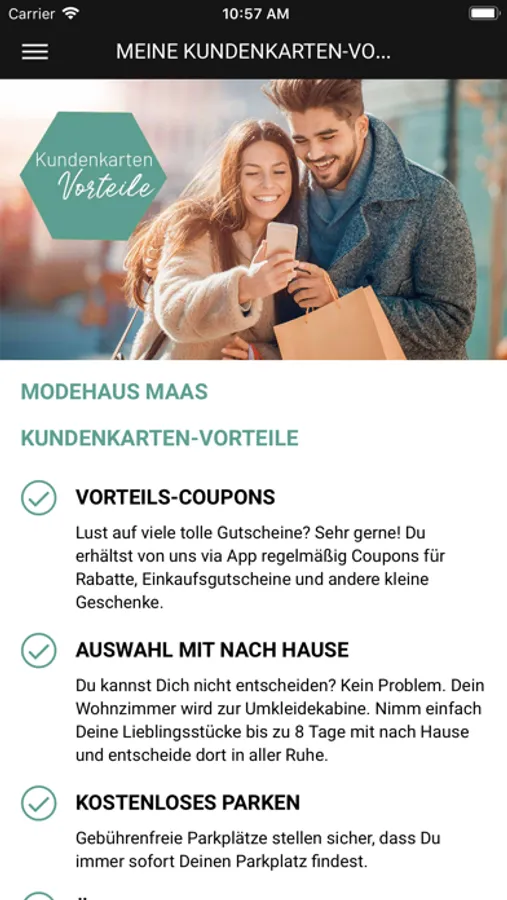 Mit der Maas App von Modehaus Maas hast du alle Vorteile direkt auf deinem Smartphone dabei! Du erhältst regelmäßig deine persönlichen Vorteile direkt per Push-Nachricht.