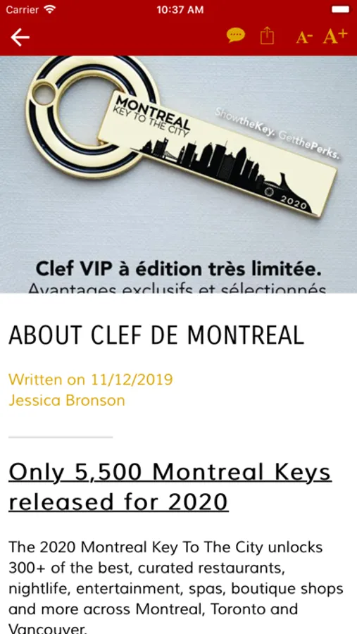 Clef de Montreal - Montreal Key To The City unlocks the very best of Montreal, Quebec restaurants, nightlife, spas, shops, hotels, entertainment and services. Businesses reward Keyholders who present and tap their Key with a unique VIP perk / benefit to thank them for their business all year long. Enjoy the VIP lifestyle with your Montreal Key To The City in Montreal, Quebec, Canada. Simply flash and tap your Montreal Key when visiting exclusive official partner restaurants and more to redeem instantly for VIP thank-you loyalty perks shown in this app.