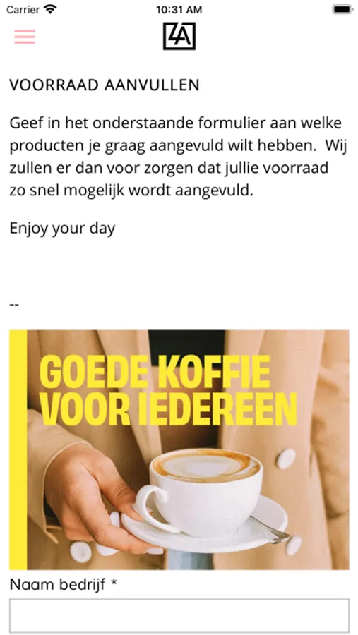 Deze app helpt je bij het onderhoud van je Animo koffiemachine. Door de handige ''step by step'' guide lines weet je precies wat je te doen staat. Ook maakt deze app het plaatsen van een bestelling erg gemakkelijk. Door het invullen van een formulier breng je ons op de hoogte van je bestelling. Wij komen vervolgens zo snel mogelijk de bestelling bij jullie bezorgen. Kom ook via deze app snel met ons in contact door een WhatsApp bericht te sturen of bel onze helpdesk. Met het lookbook kun een kijkje achter de schermen nemen bij de HQ of Zarano the coffee company.