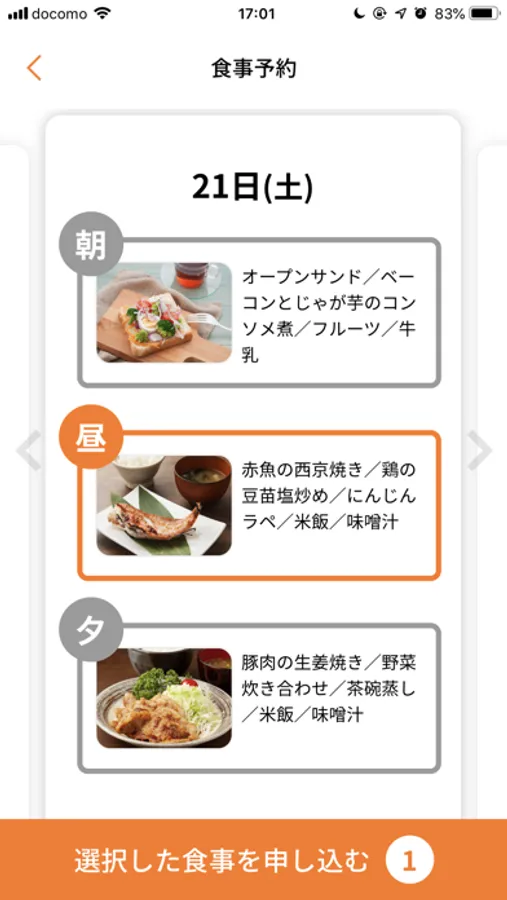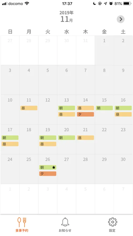 アプリ上のカレンダーから食事メニューを確認しながら簡単予約。