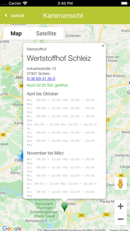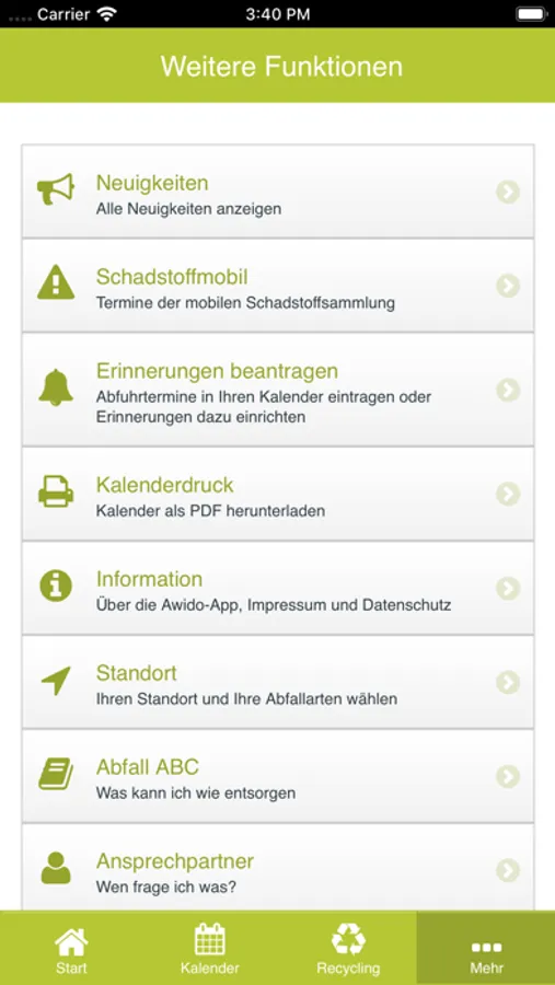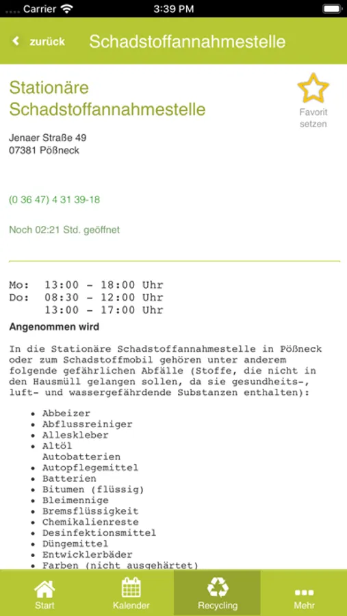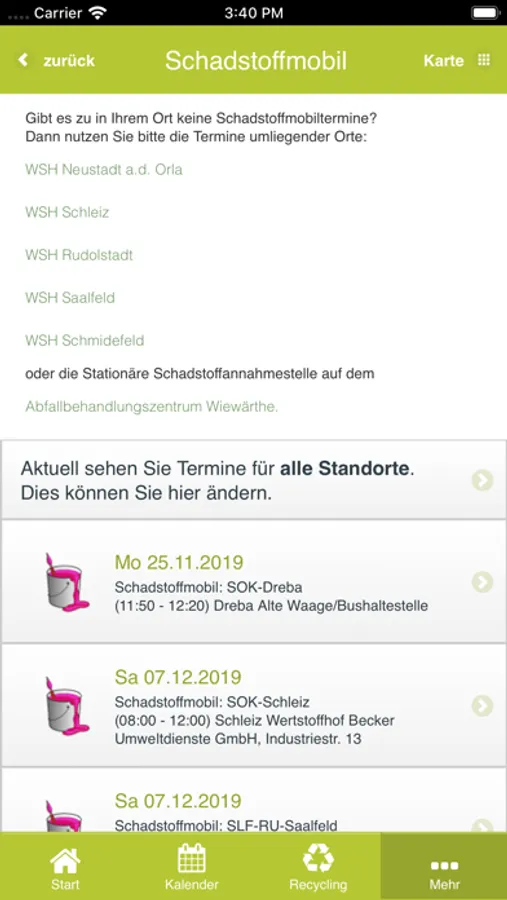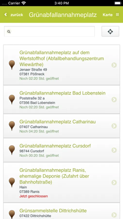 * Annahmestellen für Abfälle aller Art mit Ortsangabe und Öffnungszeiten, inkl. Kartenansicht und Navigation.