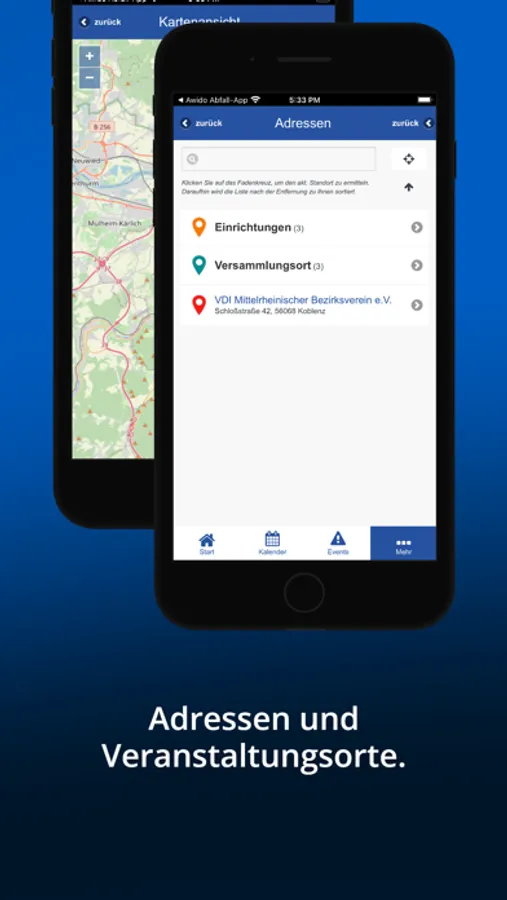 * Detaillierte Informationen zu Terminen und Events mit Ortsangabe und Zeiten, inkl. Kartenansicht und Navigation.