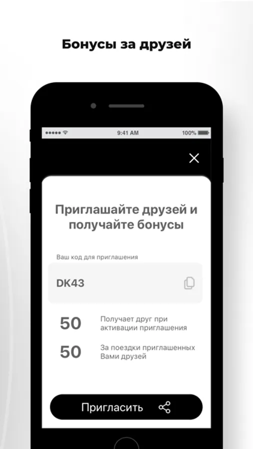 Специально для пользователей нашего приложения, существует выгодная акция «Пригласи друга». В конце каждой поездки Вам дается уникальный код, который Вы можете отправить своему другу и получить +50 р. на бонусный счет обоих.