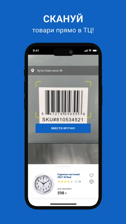 За допомогою додатку скануйте штрих-код товару або вводьте код вручну у торговельному центрі, щоб дізнатися актуальну ціну, отримати детальну інформацію, ознайомитися з характеристиками, почитати відгуки.