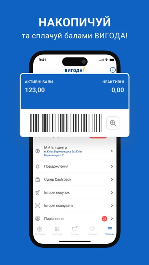 Перевіряйте актуальний баланс балів всього в кілька кліків. Щоб відсканувати карту на касі у Торговельному центрі «Епіцентр», потрібно лише відкрити додаток на смартфоні і обрати ВИГОДА на головній сторінці.