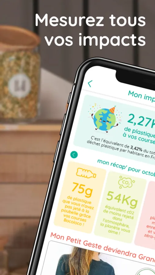 Vos courses ont de l'impact ! Retrouvez sur votre application Bocoloco l'ensemble de votre impact avec vos courses Bocoloco : économie de plastique, de CO2, gaspillage évité ... !