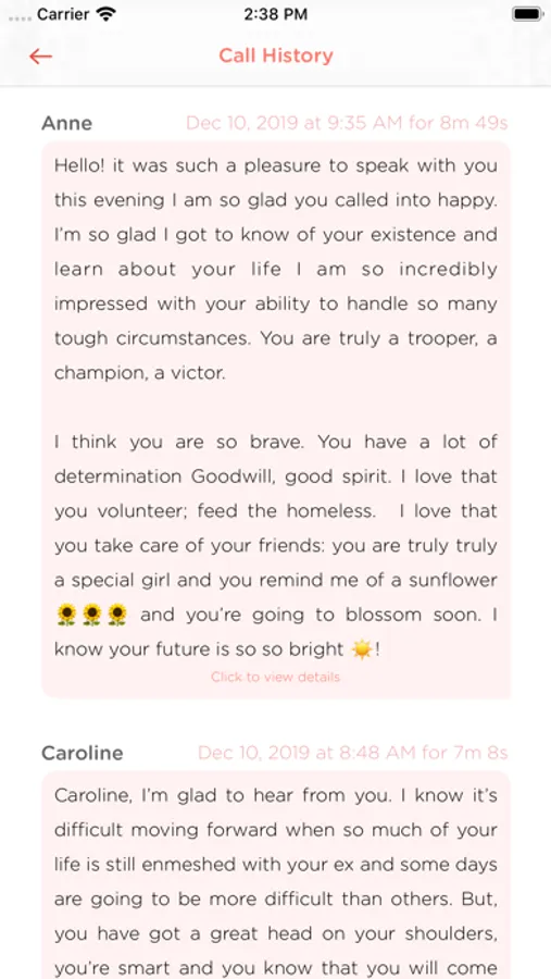 It is important to the founders that Happy provides affordable access to the emotional nourishment individuals deserve. Rates are 24 dollars an hour, prorated at 40 cents per minute, so you only pay for the time you need.