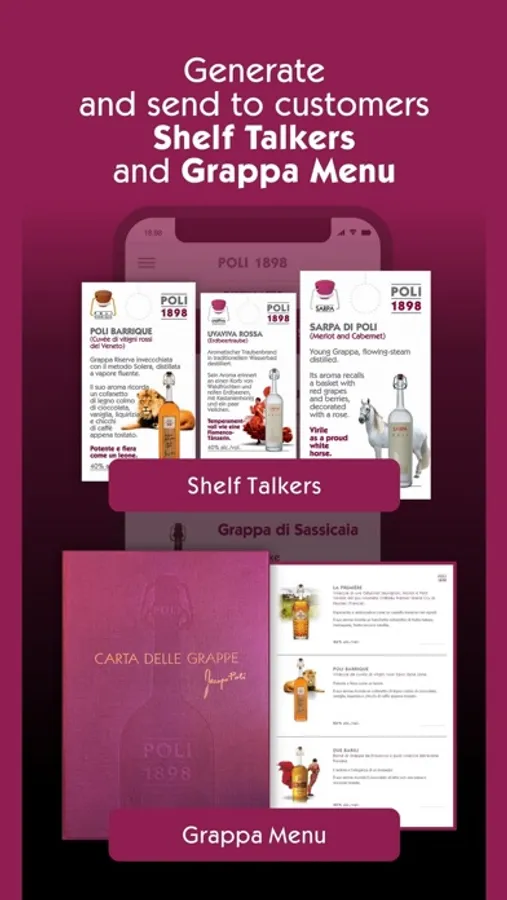 Generate Grappa Menu and Shelf Talkers in PDF format, ready to be sent and printed by the customers or by the Poli Distillery.