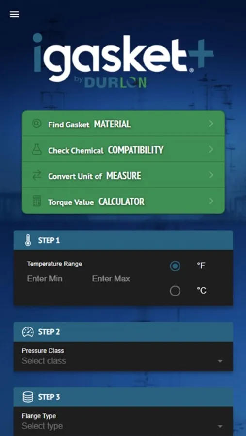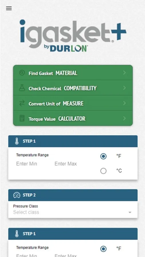 iGasket Plus is a simple, intuitive interface used by engineers and service technicians in the field. Based on a variety of user inputs, a list of compatible Durlon® gaskets is generated using temperature, pressure, fluid and flange type. Additional functionality: "Torque Value Calculator" and "Unit of Measure Converter".