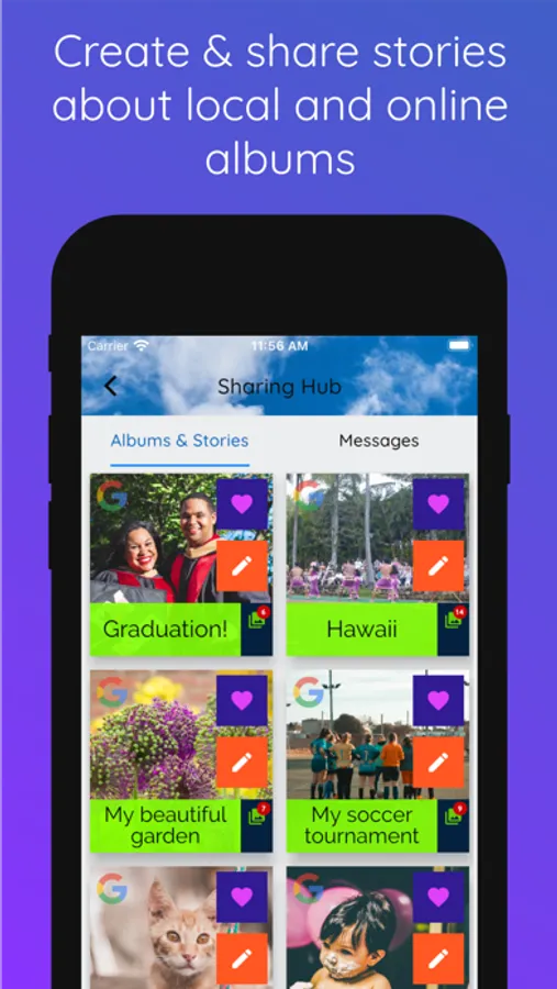 * create and edit stories from anywhere about shared online albums to share with loved ones you can't see in-person