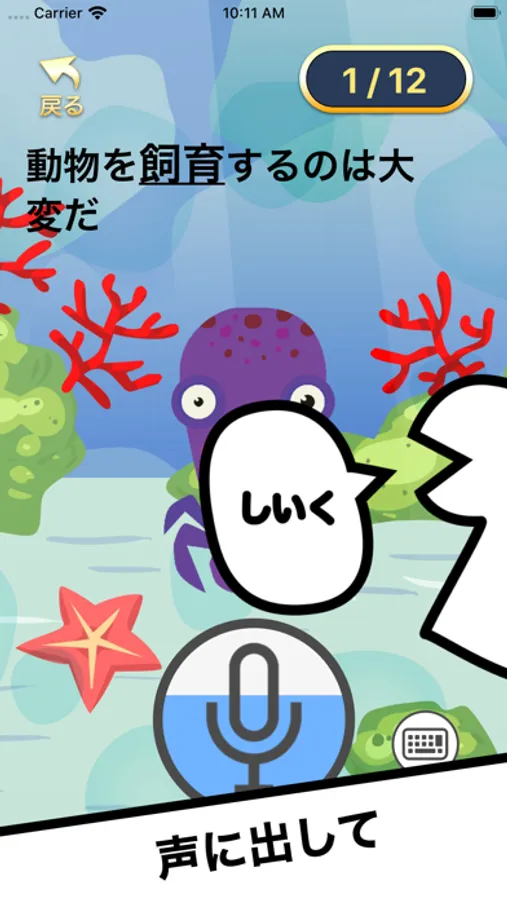 上側に漢字問題が表示されます。表示された下線が書かれた部分を声に出して読んでください。