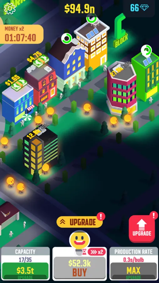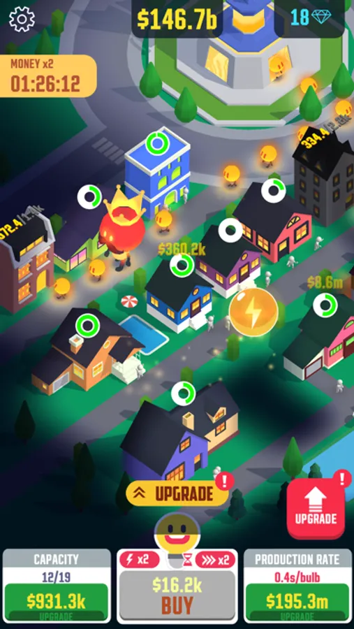 In this idle, tap tap and clicker game, you can unlock and discover lots of buildings, enjoy amusement park. Earn cash, buy upgrades, produce lightbulbs faster and expand the city.