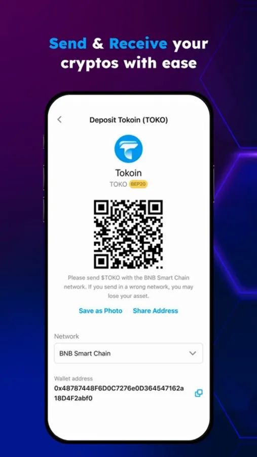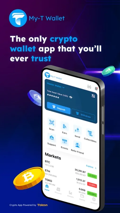 It is the first official digital wallet from Tokoin where you can store and transfer your TOKO token. Besides TOKO, you can also manage multiple cryptocurrencies including Bitcoin and Ethereum. Check your balance, transaction history, and securely send and receive cryptocurrencies in this all-in-one crypto app!