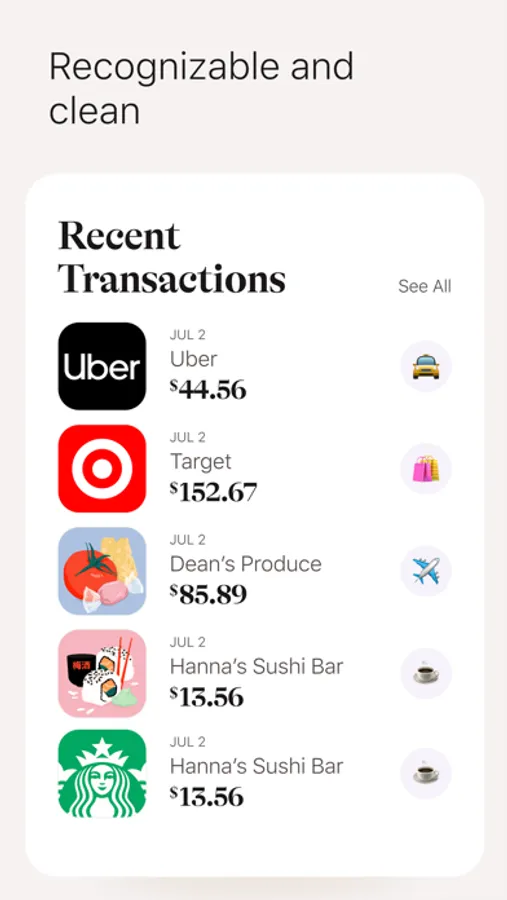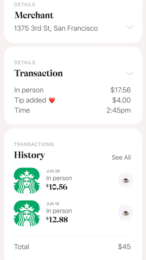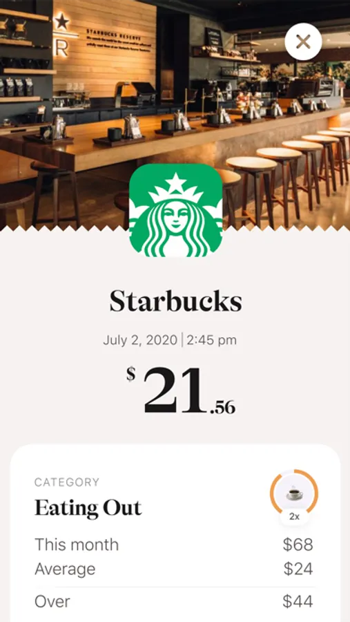 Get the picture, map and logo of your merchant. See how this purchase affected your overall category spend for the month as well as the history of your spend with this merchant. If you added a tip, you’ll see a red heart next to it. Now you can understand and get the full context of all your spending habits.