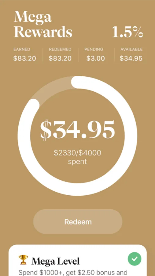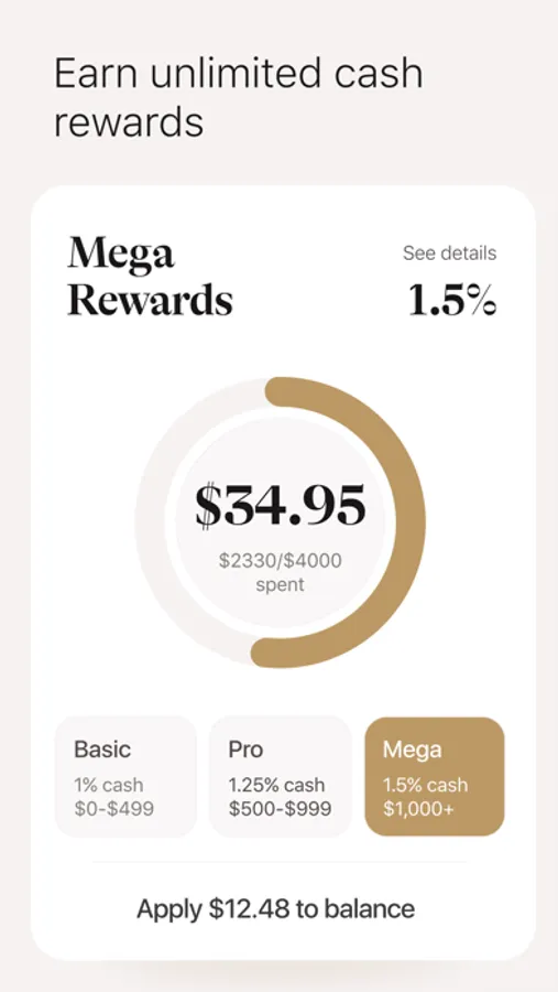 Start each month with Basic Level, 1% cash back, on all your purchases up to $499. Spend between $500-$999 and earn Pro Level, 1.25% cash back. Reach the Mega Level when you spend $1,000+ and earn an unlimited 1.5%** on all your purchases that month. Apply the rewards toward your balance at any time.