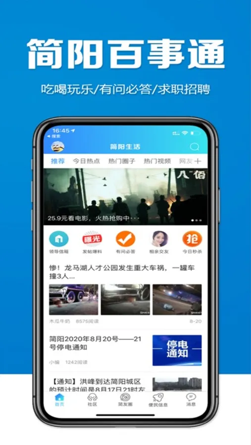 简阳生活官方app,提供简阳新闻资讯、吃喝玩乐美食推荐、公交查询、房屋租售、求职招聘、同城交友等丰富功能的手机客户端。