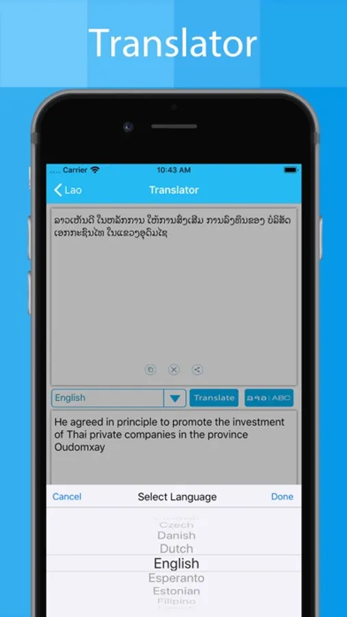 Lao Translator app will allow you to translate message, story and you can share translated text to your friends and family bye Facebook, twitter and emails.