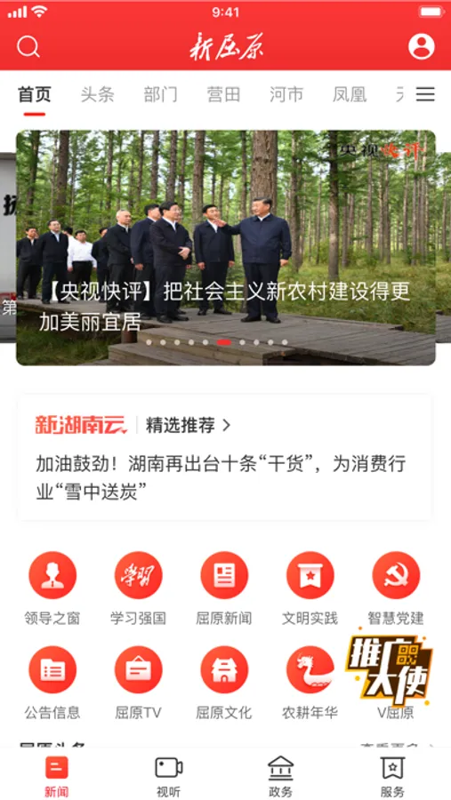 新屈原客户端是屈原管理区区委、区政府适应新媒体发展潮流,利用湖南日报社开发建设的“新湖南云”数据资源和技术支持,提供新闻、民生资讯、政务服务的官方客户端。“新屈原”综合应用文字、图片、视频、H5等多媒体手段,打造全新融媒体产品,力图传播屈原管理区声音,展现屈原管理区形象,彰显屈原管理区魅力。"新屈原"将成为发布屈原管理区政策的主平台、获取屈原管理区信息的主渠道、对外讲并传播屈原管理区建设成就的新窗口。